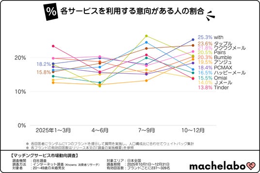 具体的な数値を見ると、1~3月期では『with』は18.2%の水準でしたが、直近の10~12月期には25.3%まで数値を伸ばし、トップとなりました。同様に『タップル』も、1~3月期の15.8%から徐々に数値を上げ、10~12月期には23.6%と高い水準になっています。