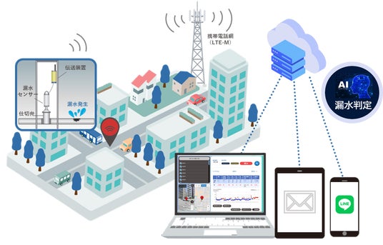 水道管路の付属設備(仕切弁・消火栓)に設置されたIoTセンサーが水道管路の状態を毎日監視。クラウドシステムのAI判定が漏水の疑いを即座に通知するため、異常時の迅速な対応が可能となります。