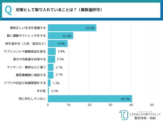 TOP3 1.規則正しい生活を意識する:23.3% 2.軽い運動やストレッチをする:12.2% 3.体を温める(入浴・温活など):9.5%