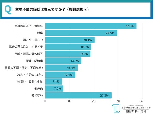TOP3 1.全身のだるさ・倦怠感:37.5% 2.頭痛:29.5% 3.肩こり・首こり:20.4%