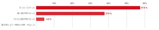 「まったくなかった」と回答した人が57.6%で最も多く、「軽い副作用があった」と回答した人が37.9%で続いた。また、「気になる副作用があった」との回答が4.5%と僅かとなり、「副作用により一時的に中断・中止した」と回答した人はいなかった。