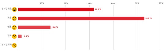 「やや満足」と回答した人が48.5%で最も多く、次に「満足」との回答が33.3%、となり、満足と感じている人が回答者全体の8割以上を占めた。反対に「やや不満」と回答した人は僅か3.0%で「不満」と回答した人はいなかった。