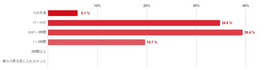 「30分~1時間」と回答した人が39.4%で最も多く、「15~30分」との回答が34.8%と僅差で続いた。また、「1~3時間」(19.7%)や「15分未満」(6.1%)との回答もみられたが、「3時間以上」や「薬の効果を感じられなかった」と回答した人はいなかった。