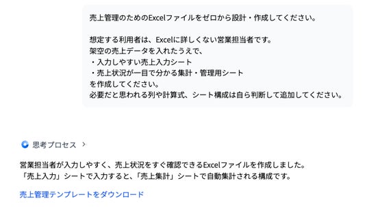 複数のデータや資料をもとにした集計表や管理表の作成、分析用シートの生成、定型フォーマットへのデータ整理などをAIが実行します。