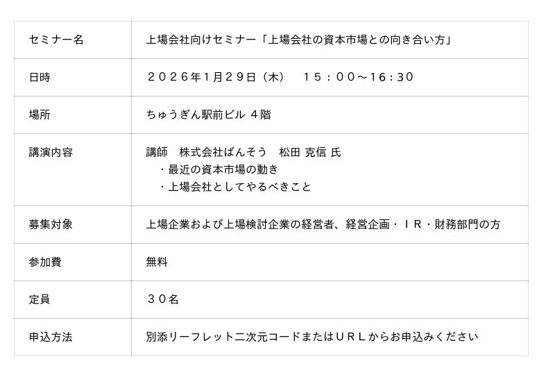 中国銀行(岡山市 頭取 加藤 貞則)では、2026年1月29日(木)に上場会社向けセミナー「上場会社の資本市場との向き合い方」を岡山市北区本町のちゅうぎん駅前ビルで開催します。