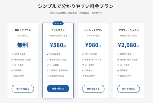 現在、主要な電子サインサービスは以下の料金体系が一般的です: