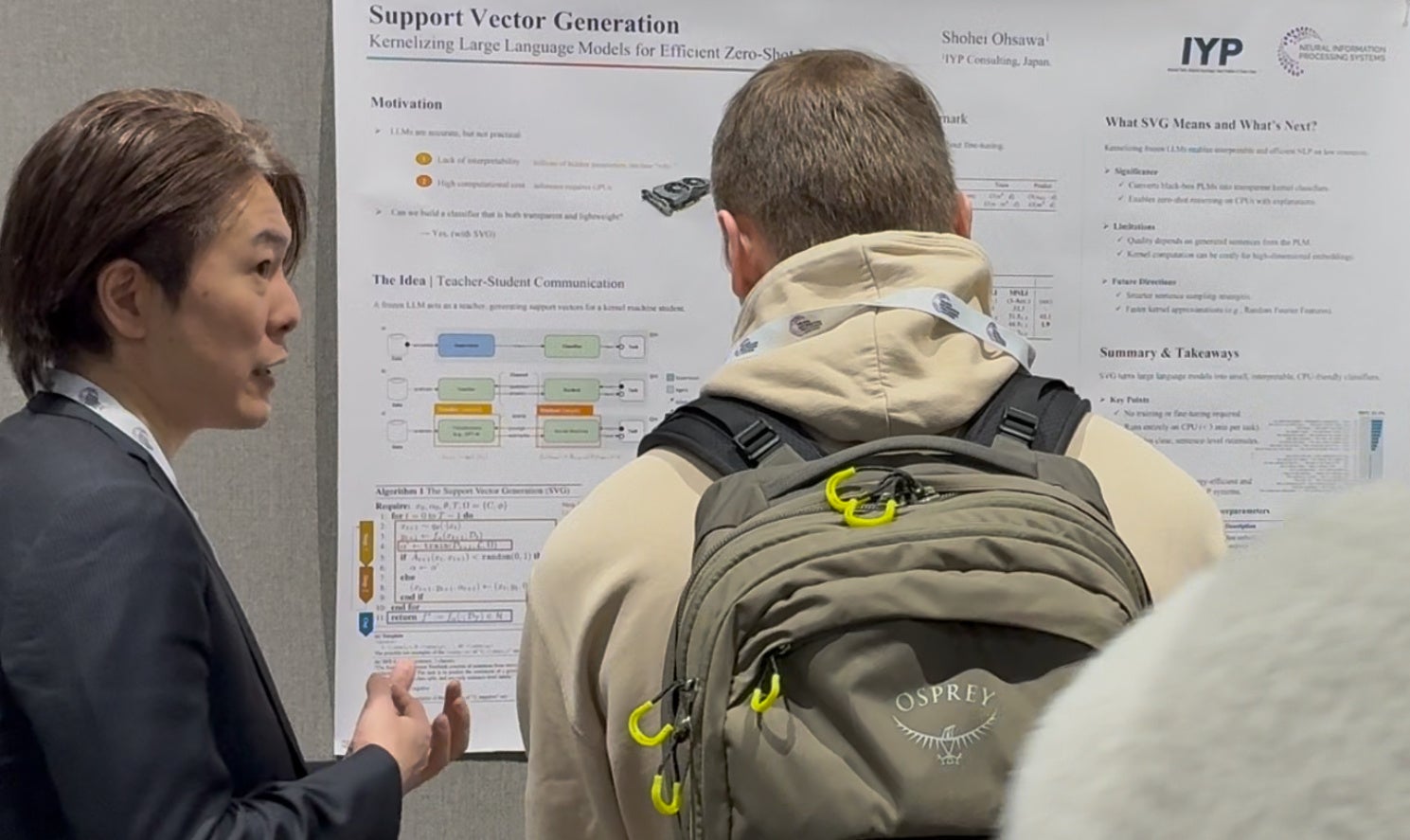 株式会社I.Y.P Consulting(本社:東京都中央区、代表取締役社長CEO:崔 晉豪、以下 IYP)は、国際会議 NeurIPS 2025 において、査読を経て採択された当社の単著論文「Support Vector Generation: Kernelizing Large Language Models for Efficient Zero-Shot NLP(SVG)」をポスター発表しました。また、会期中は次世代のAI人材との対話機会として、日本人の学生・ポスドクを中心に20名以上と、ランチ・ディナー・ポスターセッション等で意見交換を行いました。発表にはオープンソースのデモも含まれ、GAFA研究者を含む100名以上から高い評価を得ることができました。