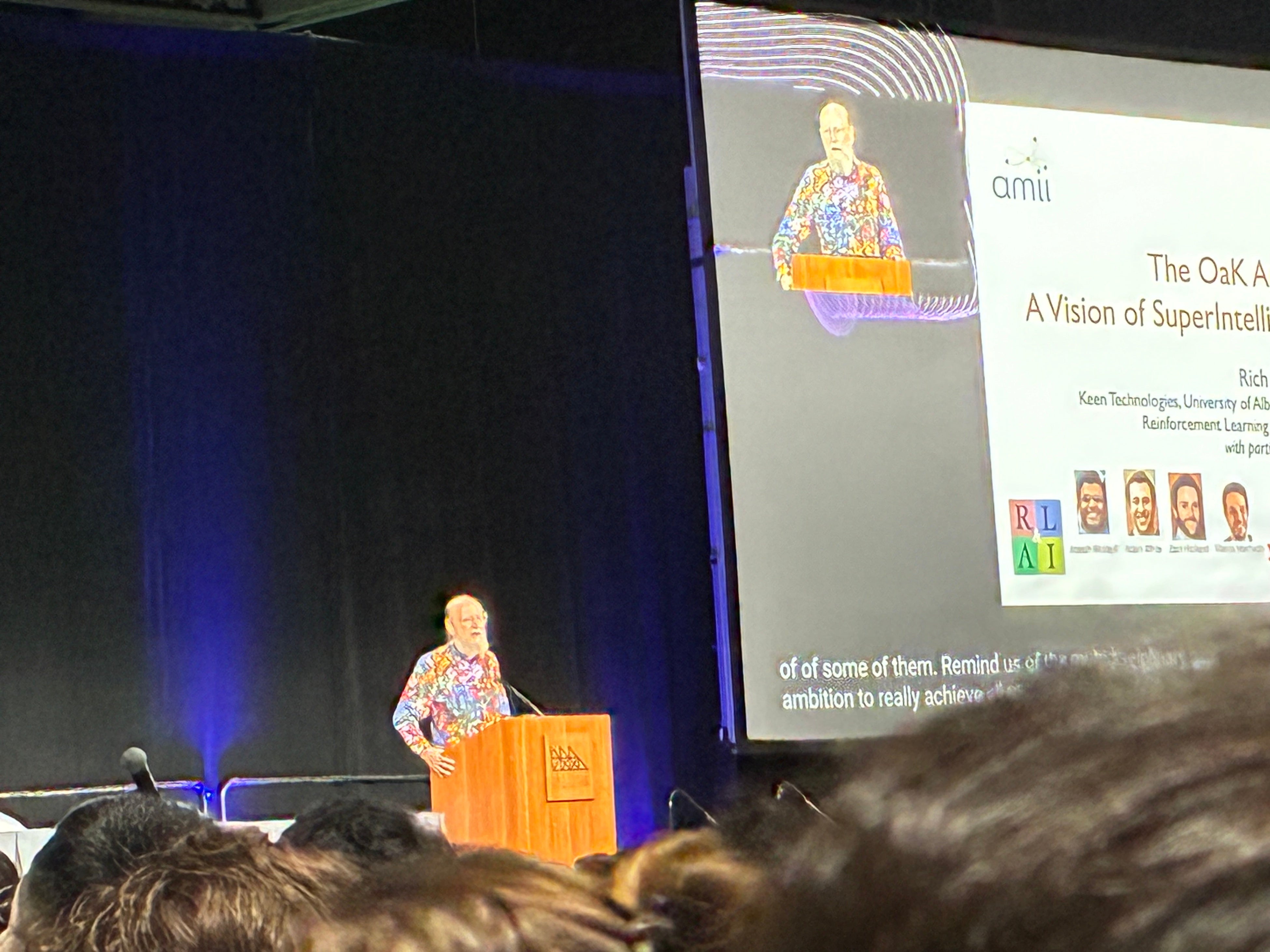 本会議は、2024年のチューリング賞受賞者で強化学習の第一人者、R Sutton氏による基調講演でスタート。AIエージェントに適した新たな学習手法、OaKフレームワークの発表がなされた。