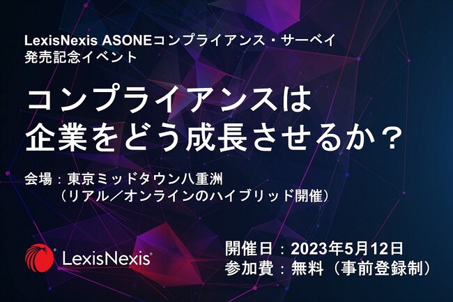 東京都港区、2023年4月11日―レクシスネクシス・ジャパン株式会社(代表取締役社長 パスカル・ロズィエ)は「LexisNexis ASONEコンプライアンス・サーベイ発売記念イベント コンプライアンスは企業をどう成長させるのか?」を、2023年5月12日(金)に開催することをお知らせいたします。※本イベントはリアル/オンラインのハイブリッド開催です。