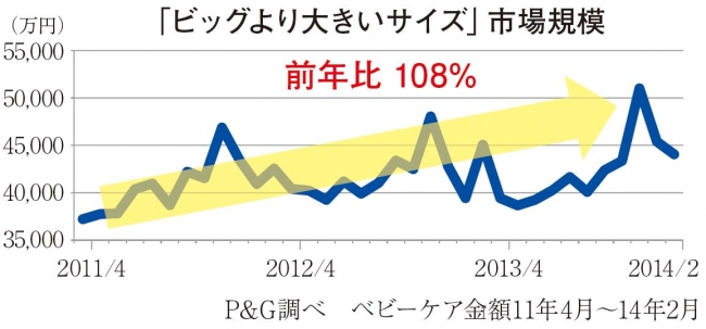 おむつの使用年齢幅が広がっている背景には、昼間の下着やトイレの使用は経験済みでも、夜間やお出かけの時の安心のためにおむつを使用するご家庭が多くいらっしゃることがあげられます。少子化でおむつの国内需要の減少が考えられる中、「ビッグより大きい」サイズ市場は、前年比108%と1割近い伸びを示しています。(P&G調べ ベビーケア金額14年7-9月)