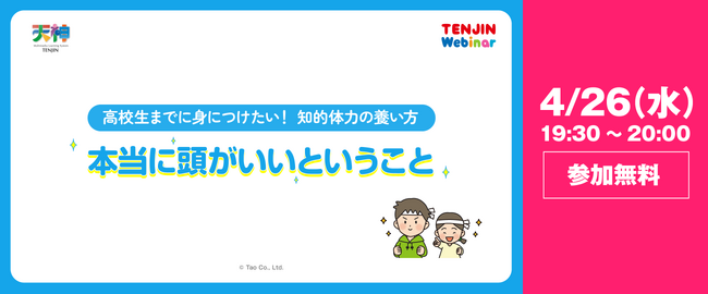 幼児・小学生・中学生を対象としたデジタル学習教材「天神」を企画・開発・販売する株式会社タオ(本社:滋賀県草津市、代表取締役:黒澤 慶昭)は、4/26の19:30から「高校生までに身につけたい!知的体力の養い方 ~本当に頭がいいということ~」と題してユーザー向けウェビナーを開催いたします。「天神」ユーザーは誰でも無料で参加でき、後日アーカイブも配信します。