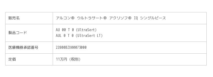 日本アルコン株式会社 (本社: 東京都港区、代表取締役社長: ジム・マーフィー、以下「アルコン」) は、白内障手術で使用される眼内レンズのデリバリーシステム「アルコン(R) ウルトラサート(R) アクリソフ(R) IQ シングルピース」(以下「ウルトラサート」)を10月3日より販売いたします。