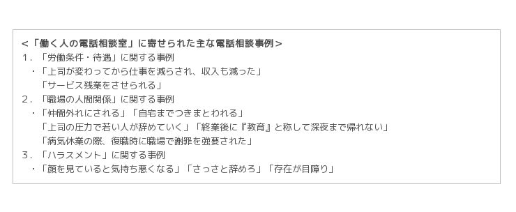 ※第11回「働く人の電話相談室」結果報告における相談内容等の詳細は、別添の「相談内容集計表」をご参照ください。
