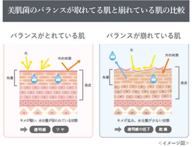 夏は紫外線や汗で悪玉菌が増えやすく、バランスがくずれがちです。美肌菌の多い肌は自然に うるおい、バリア機能も健やかです。