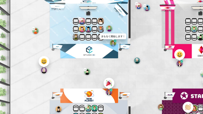 reBako.ioのオンライン会場には出展企業の各ブースが設置され、参加者は気になる企業を訪ねて担当者とビデオチャットでお話しができます。選択したアバターを操作してリアル会場と同様の臨場感でバーチャル空間の会場を自由に歩き回ることができます。