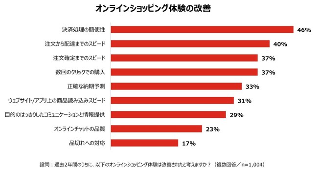 ・コロナ禍の過去2年間に、オンラインショッピングで改善したと感じるのは「決済処理の簡便性」(46%)と「注文から配達までのスピード」(40%)。「品切れ」(17%)や「オンラインチャット」(23%)には改善の余地あり