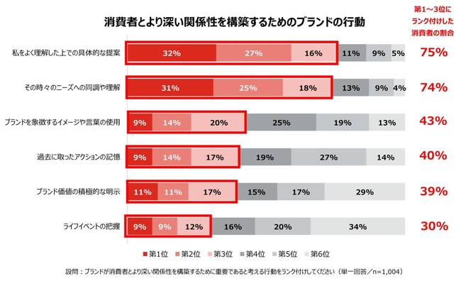 消費者に対して、消費者とより深い関係性を構築するために重要なブランドの行動をランク付けするように尋ねたところ、第1~3位にランク付けした消費者の割合が顕著に高かったのは「私をよく理解した上での具体的な提案」(75%)「その時々のニーズへの同調や理解」(74%)であった。この結果から、消費者自身が持つニーズの本質を見抜いた提案とともに、共感や理解を示してくれるブランドを求めていることが明らかになった。また、若年層の消費者ほど、「そのブランドで自分が過去に取ったアクションを記憶していてほしい」と回答する傾向が強くあった。
