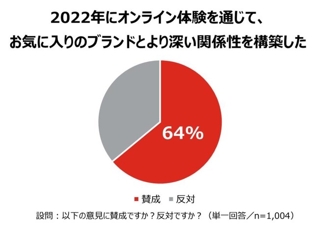 ブランドとの関係性構築について、81%が「ブランドは消費者と個人レベルで繋がるべきである」と考えていることが分かった。また、64%が「2022年にオンライン体験を通じて、お気に入りのブランドとより深い繋がりを構築した」と感じており、コロナ禍においても、約2/3の消費者はオンライン体験を通じて、お気に入りのブランドとより深い繋がりを構築できたことが分かった。