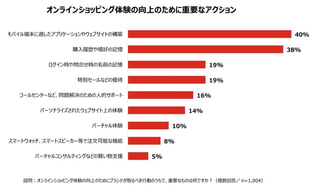 「オンラインショッピング体験の向上のために、ブランドが取るべき重要なアクションは何か」と尋ねたところ、「モバイル端末に適したアプリケーションやウェブサイトの構築」(40%)「購入履歴や嗜好を記憶していること」(38%)と、約40%がモバイル端末でのショッピング体験の向上を求め、効果的なパーソナライゼーションを重要視していることが明らかになった。