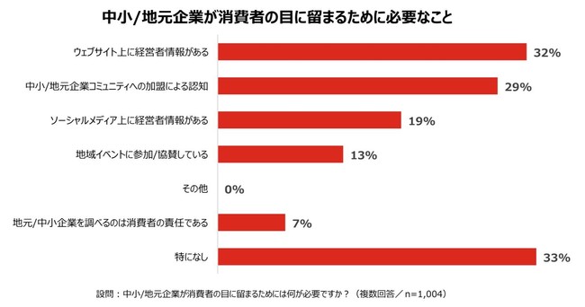 また、「中小/地元企業が消費者の目に留まるためには何が必要か」と尋ねたところ、「ウェブサイト上に経営者情報があること」(32%)と回答した割合が最も高く、中小/地元企業においてもウェブサイト上での情報発信による、信用性の獲得が重要であることが推測される。