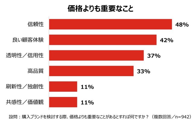 「購入ブランド検討の際、価格よりも重要なことがあるとすれば何か」と尋ねたところ、「信頼性」(48%)「良い顧客体験」(42%)「透明性/信用性」(37%)と、価格よりもブランドの「体験」や「信頼性」を重要視する傾向があった。価格の上昇を補うには、消費者との信頼性の構築や優れた体験の提供が重要であることが分かった。