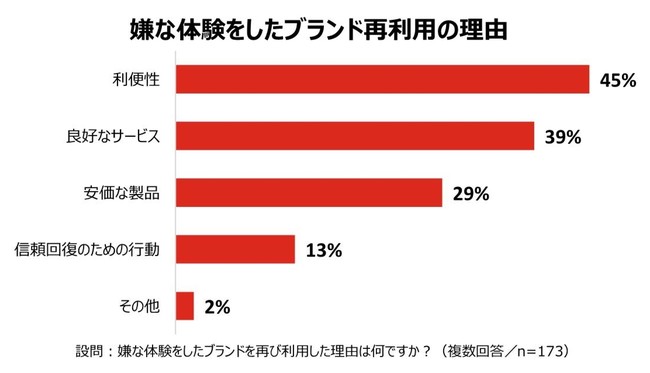 嫌な体験をしたブランドで再び買い物をした経験がある消費者に対し、その理由を尋ねたところ、「利便性」(45%)「良好なサービス」(39%)「安価な製品」(29%)と、サービスの質よりも利便性が上回る結果となった。オンラインショッピングの発展に伴い、過去の体験を上回るほどの利便性に優れたブランドは、再び購入の選択肢となりうる状況が予測される。