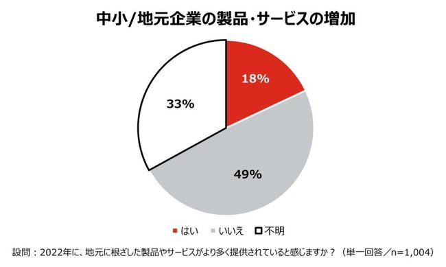 「2022年に、地元に根ざした製品やサービスがより多く提供されていると感じるか」と尋ねたところ、その増加を実感しているのは18%であり、中小/地元企業の認知度不足が伺い知れる結果となった。