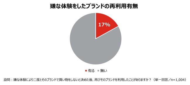 「嫌な体験をして二度とそのブランドで買い物をしないと決めた後、再びそのブランドを利用したことがあるか」と尋ねたところ、そのような経験があるのは、わずか17%だった。たった一度の嫌な体験であっても、その後のブランド利用に関して多大な影響を与えうることが明らかになった。