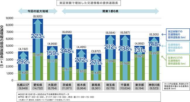 一般財団法人 道路交通情報通信システムセンター(VICSセンター 所在地:東京都中央区 理事長:長榮周作)は、公益財団法人 日本道路交通情報センター(JARTIC 所在地:東京都千代田区 理事長:池田克彦)と共同で、「プローブ情報を活用した道路交通情報サービス」の実証実験の対象地域を、2022年1月13日(予定)より、関東1都6県に加え、札幌エリア、愛知県、大阪府へ拡大します。