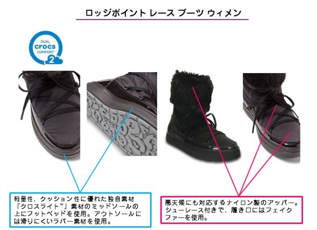 「ブーツコレクション」は、クロックスブランドのDNAである独自の「クロスライト™」素材のミッドソール、もしくはミッドソールとアウトソールの上にフットヘッドを使用した、「デュアルコンフォート」を採用。より進化したクッション性の高さを提供します。