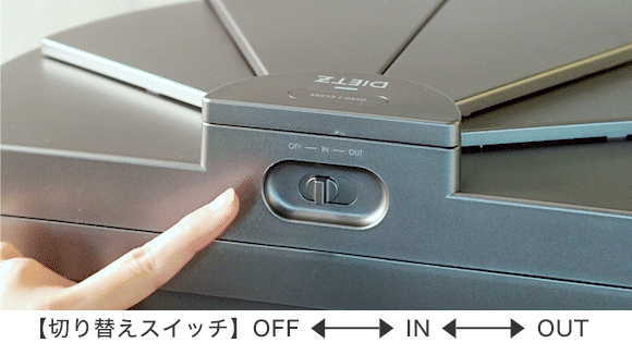 「INセンサー」と「OUTセンサー」の切り替えは、ゴミ箱のフタ背面にあるスイッチで簡単に切り替える事ができます。スライドさせるだけで複雑な操作は一切ありません。