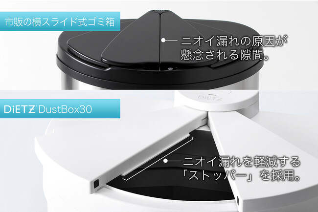 「ストッパー」を付ける事により左右のフタ扉の隙間面積が約70%以上縮小され、それに比例してゴミ箱内のニオイ漏れも軽減される計算になります。