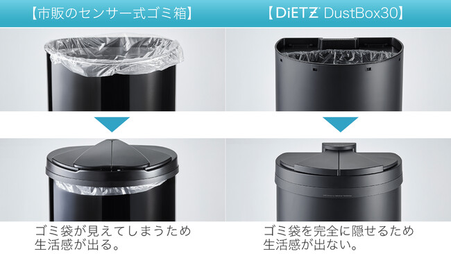 DiETZ(ディーツ)DustBox30は「ゴミを捨てるのではなく収納する」というのがコンセプトの1つでもあります。ゴミ箱を、ただのゴミを捨てる箱ではなく「ゴミを収納するインテリア」として考えた時、やはりどうしても気になるのがゴミ袋がゴミ箱から見えてしまうという事です。 ゴミ袋が見えていると、どうしてもゴミ箱のイメージ(汚い、見える場所に置きたくない)が強くなります。