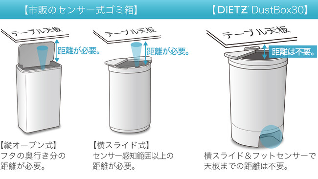 DiETZ(ディーツ)DustBox30はセンサーがゴミ箱の下部にあるため、仮にゴミ箱とテーブルの天板の間に1cmしか距離が無かったとしても、天板にセンサーが反応しフタが勝手に開くという事はありません。
