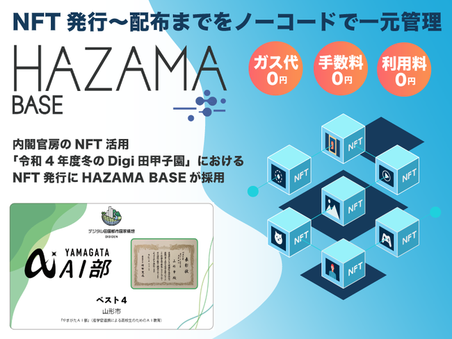 ブロックチェーン・スタートアップの株式会社IndieSquare(本社:東京都渋谷区、代表取締役:星野 裕太、以下「当社」)は、2022年9月に行われた「令和4年度 夏のDigi田甲子園」に続き、2023年3月9日に行われた内閣官房が開催するイベント「令和4年度冬のDigi田甲子園*1」の表彰式で副賞として受賞自治体に渡されたトロフィー、NFTの作成において、昨年5月にサービス提供を開始したノーコードでNFTの発行から配布までを安全に行えるWeb3ソリューション「HAZAMA BASE」が採用されたことを発表します。