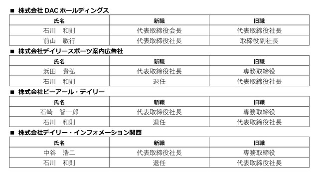 株式会社DACホールディングス(本社:東京都台東区、代表:石川和則・前山敏行)は、2023年1月26日開催の定時株主総会におきましてDACホールディングス及びグループ各社の、代表取締役会長及び代表取締役社長の就任がございましたことをお知らせいたします。新役職は以下の通りとなります。