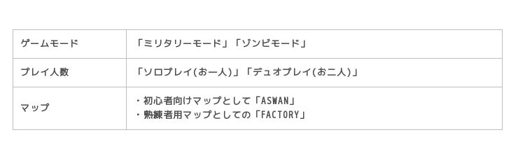 ゲームモードとしましては「ミリタリーモード」「ゾンビモード」が存在し、「ソロ(お一人)」「デュオ(お二人)」、そして初心者向けマップとして「ASWAN」、熟練者用マップとしての「FACTORY」を実装しております。