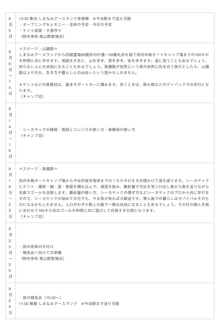 ·応募要項:「しまなみ野外学校」のオフィシャルサイトに掲載されている申込用紙と作文用紙にプログラム参加を希望する理由(200-400文字)を記入の上、事務局宛にメールもしくは郵送でお送りください。書類審査の上、合格者の方には、合格通知と二次審査(面接)日程の入った書面を郵送します。二次面接はしまなみアースランドでの対面による面接ないし、遠方の方はアプリ等を用いてビデオ電話で実施します。詳細は、しまなみ野外学校オフィシャルサイトにてご確認下さい。(しまなみ野外学校オフィシャルサイト https://note.com/shimanami/m/m45a25f4cb21c)