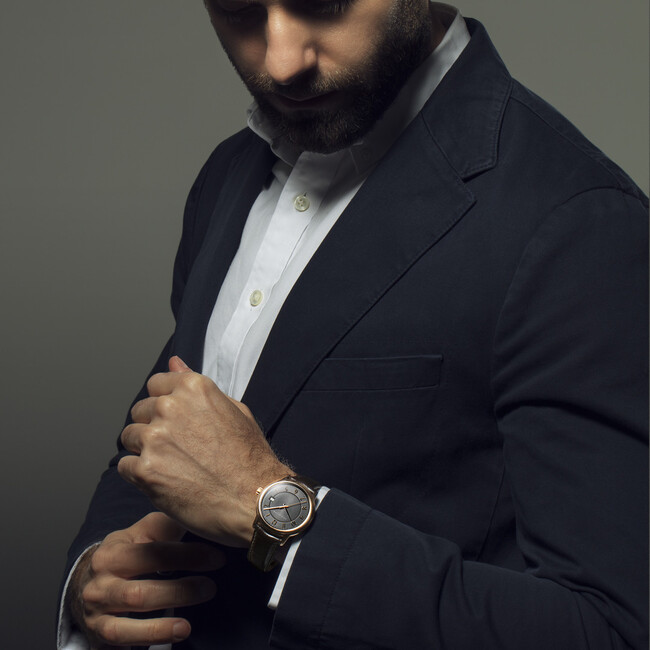 文字盤とケースが与えるリッチで艶やかな印象を引き立てるように、ローズゴールドとブラックの中間色で