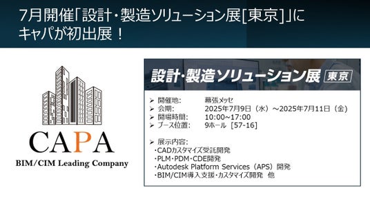 株式会社キャパ(本社:東京都千代田区、代表取締役会長:吉良平四郎)は、2025年7月9日(水)から2025年7月11日(金)に開催される「ものづくりワールド[東京]」内「設計・製造ソリューション展[東京](DMS)」に初出展します。