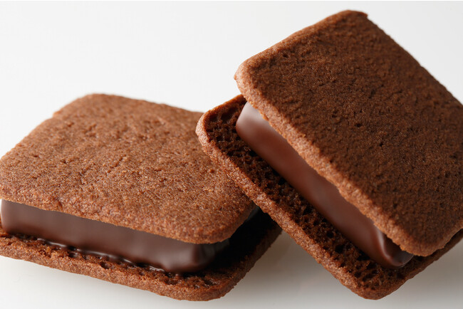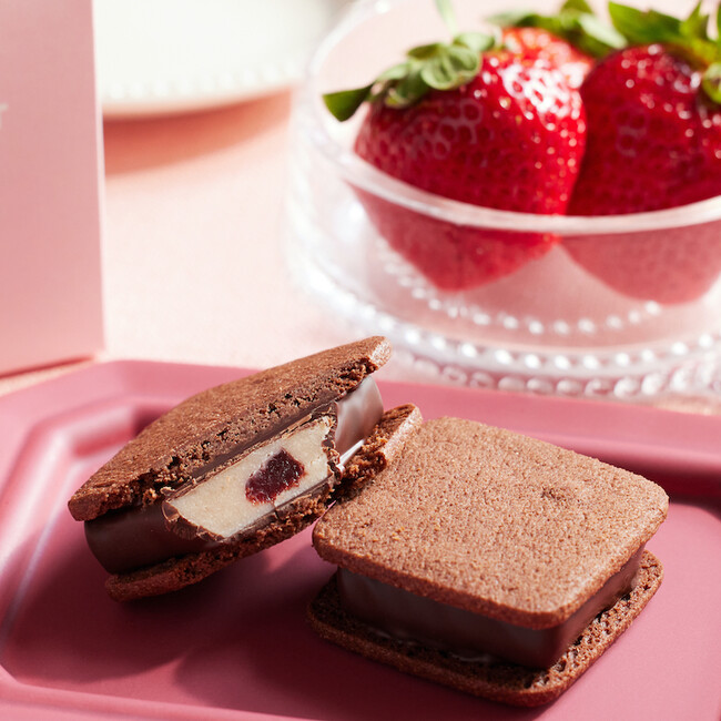 旬を迎える苺”あまおう”の果実を口どけ滑らかな生チョコに混ぜ合わせ、ビターチョコレートでコーティング、ココアクッキーでサンドしました。みずみずしく甘酸っぱい風味を雑味のないチョコレートと共にお楽しみください。
