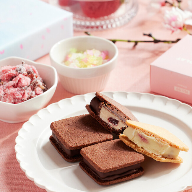 桜の花の塩漬けを手作業で丁寧に塩抜きしたものを優しい甘さの生チョコに混ぜ合わせ、丁寧に焼き上げたサクサクのクッキーでサンドしました。チョコレートの程よい甘さと桜の塩気が後を引く、今だけの美味しさです。