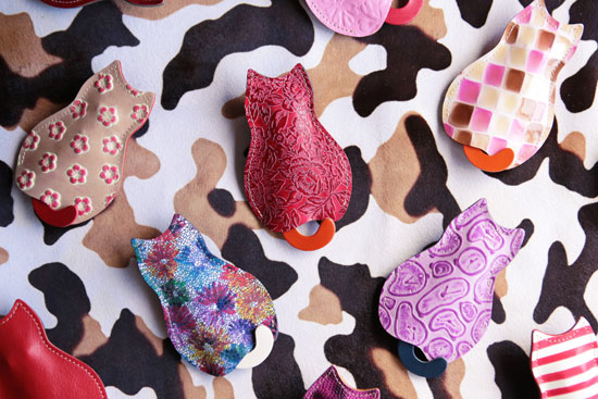 屋号であるクアトロガッツはスペイン語で訳すと”4匹の猫”となっており、工房に集う仲間もなぜだか猫好きが増えていった。猫の魅力の一つである、流れるような曲線からインスピレーションをうけた「しっぽを引っ張る猫のキーケース」は、昔工房で飼っていた太っちょ猫のテンちゃんがモチーフとなった。