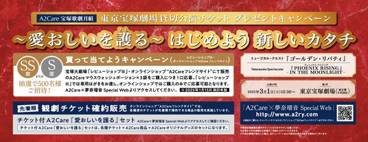 エーツーケア株式会社(本社:東京都港区、代表取締役社長:石原 嘉文)は、A2Careご愛用の感謝を込め、2025年3月1日(土)15時30分 東京宝塚劇場(東京都千代田区)にて公演される、宝塚歌劇月組公演 ミュージカル・クエスト『ゴールデン・リバティ』/Takarazuka Spectacular『PHOENIX RISING』-IN THE MOONLIGHT-のA2Care貸切公演《愛おしいを護る》キャンペーンを2024年11月15日(金)よりスタートいたします。