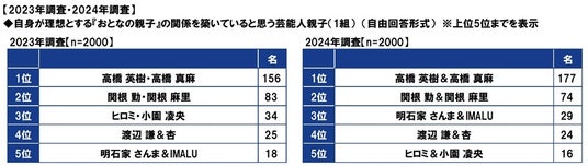 過去の調査結果とあわせてみると、3年連続で「高橋 英樹さん&高橋 真麻さん」が1位、「関根 勤さん&関根 麻里さん」が2位、「渡辺 謙さん&杏さん」が4位となり、2年連続で「明石家 さんまさん&IMALUさん」が3位でした。また、「小泉 純一郎さん&小泉 孝太郎さん」親子が初のTOP10入りとなりました。