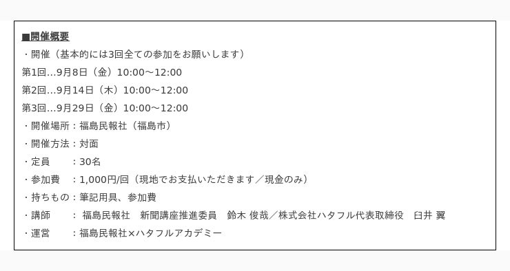 今回の講座は、民報社ベテラン記者による基礎知識に加え、ハタフル代表・臼井によるWeb記事ならではの特色やWebと紙の違いなど、Web制作会社ならではの切り口も交えながら行われます。情報取集の方法や記事を書く流れ、取材の方法、スマートフォンでの撮影方法など、3日間に渡ってしっかりと学ぶことができるので未経験者の方も安心です。