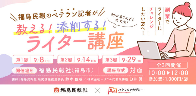 株式会社ハタフル(本社:福島県郡山市、代表者:臼井翼)が運営するWebデザイナー養成スクール「ハタフルアカデミー」。この度、福島民報社とコラボレートし、ライター講座を共同開催することが決まりました(日程:9月8、14、29日の全3回)。これまでライティングのお仕事をしたことがない未経験者の方も大歓迎。現在、参加者を募集中です!この機会にぜひ学んでみませんか?