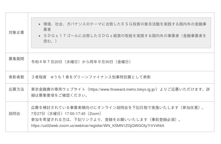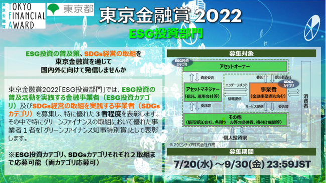 この度は、「ESG投資部門」として、環境、社会、ガバナンスのテーマに合致したESG投資の普及活動を実践する金融事業者及びSDGs経営の取組を実践する事業者の募集を開始しますのでお知らせします。