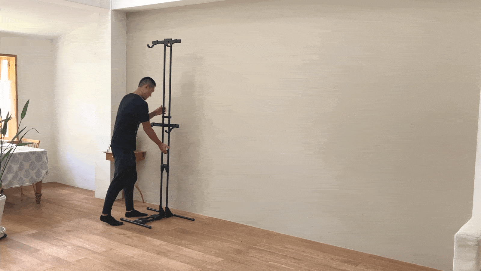 自立式のスタンドなので、お部屋の壁・床・柱などに穴をあけることなく設置が可能。賃貸にお住まいの方にもオススメです!