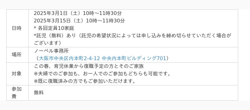 認定NPO法人ノーベル(本社:大阪市中央区、代表理事:長谷 亜希、以下:ノーベル)は、この春、育休を終えて職場へ復帰される方を対象に、復帰後の生活準備を進めるためのセミナーを開催します。